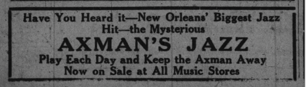The cartoon later became the sheet music cover for the ragtime piece “The Mysterious Axman’s Jazz (Don’t Scare Me Papa).” The composer, Joseph Davilla, was apparently inspired to capitalize on the Axman’s crimes and his threat to strike again. Advertisers even used the Axman’s stunt to sell Davilla’s sheet music—a mere two months later!