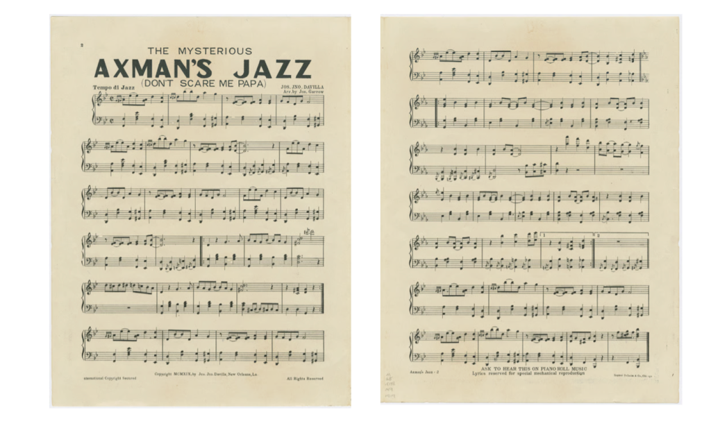 The Squirrel Nut Zippers, a present-day group that is inspired by the sound of Cab Calloway, covered “The Mysterious Axman’s Jazz (Don’t Scare Me Papa)” in 2018. In their rendition, they reimagine Davilla’s ragtime piano piece for a full band, including violin—a common jazz instrument in New Orleans at jazz’s birth. The driving beat evokes a sense of chaos from the night of the Axman’s planned attack as seen in the Times Picayune’s cartoon.