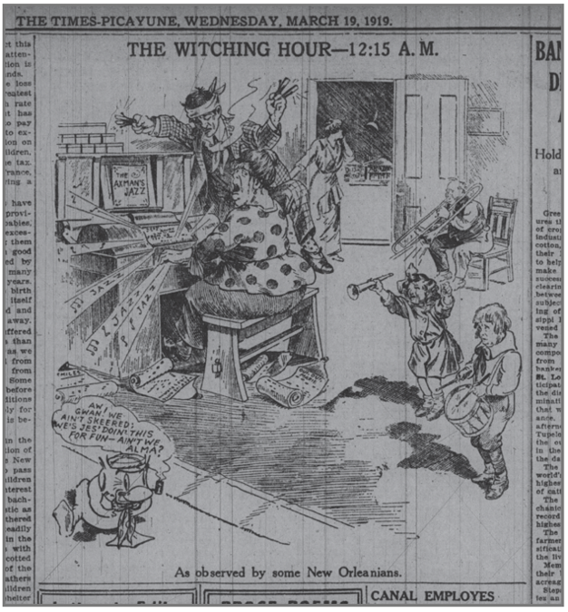 As he wrote, “I am very fond of jazz music and I swear by all the devils in the nether regions that every person shall be spared in whose house a jazz band is in full swing at the time I just mentioned.” In 1919, the popularity of jazz was growing, entering homes through the recorded sounds of white jazz bands like the Original Dixieland Jass Band, who first recorded in 1917. Black blues singers and jazz musicians would not be heard on record until Mamie Smith’s “Crazy Blues” of 1920. Those without a phonograph could hear live performances through touring ensembles, and those in cities could attend live performances in clubs. That Tuesday, March 18, the people of New Orleans flocked to jazz clubs, played records, or even performed jazz music in their homes to keep the Axman away.